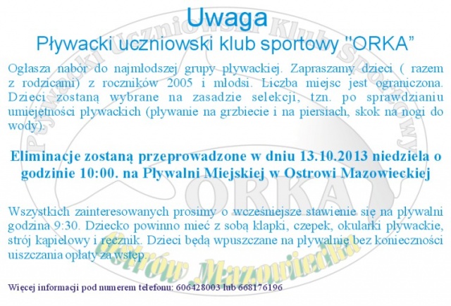 Eliminację odbędą się w niedzielę 13 października na Pływalni Miejskiej. Mogą w nich wziąć udział dzieci wraz z rodzicami z roczników 2005 i młodsi. Ze względu na ograniczoną liczbę miejsc nabór zostanie przeprowadzony na zasadzie selekcji.