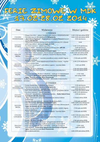 11:00-13:00 sala zielona MDK - Witamy ferie 2014 - zabawy i konkursy przy muzyce i niespodzianki