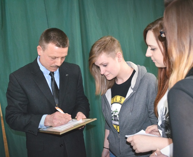 Uczniowie Rubinka chętnie zadawali pytania dotyczące jego szkoły oraz pracy. Największym zainteresowaniem cieszyła się opowieść jak dostał się do szkoły wojskowej. Na koniec uczennica naszej szkoły Agnieszka Dzierka zaśpiewała piosenkę pt:"Jedna chwila". W podziękowaniu za znalezienie czasu i opowiedzenie tylu ciekawych historii naszemu gościowi został wręczony skromny upominek.