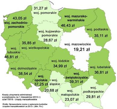 Wśród urzędów marszałkowskich największe koszty w przeliczeniu na jednego mieszkańca generują województwa - lubuskie (46,81 zł), warmińsko-mazurskie (46,43 zł) i zachodnio-pomorskie (43,05 zł). Na Mazowszu kwota ta jest więcej niż o połowę niższa, a należy pamiętać, że na jednego urzędnika przypada tutaj największa liczba potencjalnych interesantów.