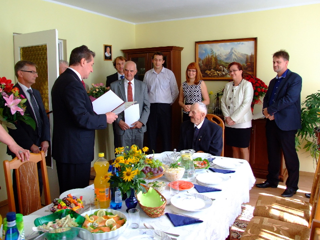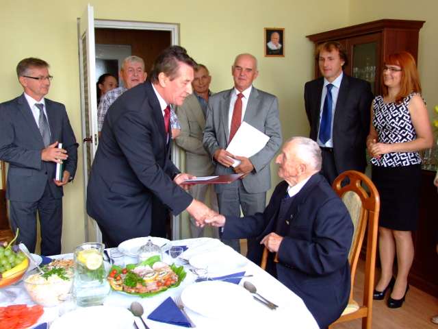 Życzenia złożyli również przedstawiciele KRUS Tadeusz Wiśniewski Kierownik Placówki w Ostrołęce i Beata Ponichtera z Ostrowi Mazowieckiej. Kierownik Delegatury Mazowieckiego Urzędu Wojewódzkiego w Ostrołęce złożył na ręce jubilata życzenia w imieniu swoim jak również w imieniu Wojewody Jacka Kozłowskiego oraz przekazał list gratulacyjny Prezesa Rady Ministrów Donalda Tuska. Dyrektor Gimnazjum w Starym Lubotyniu w imieniu swoim, grona pedagogicznego i młodzieży szkolnej złożyła Panu Piotrowi życzenia oraz wyrazy uznania za patriotyczną postawę, która jest wzorem dla nas wszystkich. W tym wyjątkowym spotkaniu uczestniczyła również licznie zgromadzona rodzin Pana Piotra. Były życzenia, kwiaty oraz prezenty.