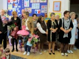 Dzieci z najstarszej grupy przygotowały piękną, bajkową część artystyczną oraz wręczyły paniom i gościom pamiątkowe krepinowe róże. Dyrektor Małgorzata Zalewska również obdarowała swoich pracowników i wszystkie dzieci słodkimi upominkami i kwiatami. Dodatkowo przyznała nagrody Dyrektora. Otrzymały je panie: Marta Kalisz, Aleksandra Jeżak, Regina Sitek i Halina Ałdycka. Natomiast nagrodę Burmistrza Miasta otrzymała Agnieszka Majewska.