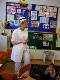 Pielęgniarka opowiedziała dzieciom o swojej pracy, o tym jak trzeba dbać o zdrowie, jak wystrzegać się infekcji i wzajemnego zarażania. Wspomniała także o tym jak dbać o czystość, higienę i jak właściwie się odżywiać. Zwróciła uwagę na niebezpieczeństwo związane z samodzielnym przyjmowaniem nieznanych lekarstw.
