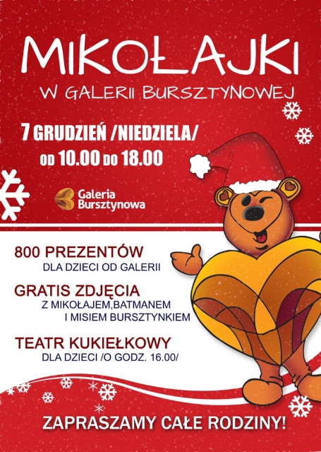 - od 10.00 do 18.00 fotograf będzie wykonywał gratis zdjęcia dzieciom z MIKOŁAJEM albo do wyboru z BATMANEM lub MISIEM BURSZTYNKIEM. Zdjęcie będzie można uzyskać od ręki.