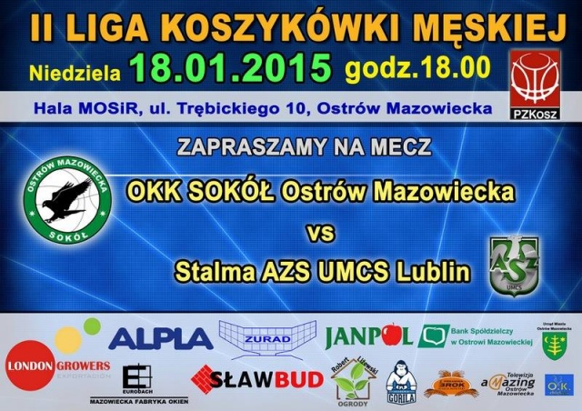 Mecz Sokoła z drużyną z Lublina odbędzie się w niedzielę, 18 stycznia o godz. 18:00, na hali MOSiR przy ulicy Trębickiego.
