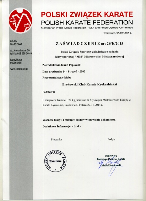 Miło nam poinformować, że Polski Związek Karate (Polish Karate Federation) nadał najwyższe klasy sportowe zawodnikom reprezentującym Brokowski Klub Karate Kyokushinkai.