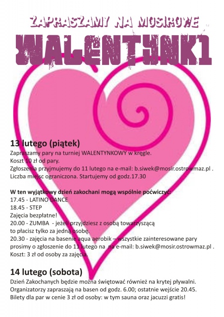 Ostatnią atrakcją tego dnia będą zajęcia na basenie aqua aerobik - wszystkie zainteresowane pary proszone są o zgłoszenie się do 11 lutego na na e-mail: [email protected] - koszt 3 zł od osoby za zajęcia.