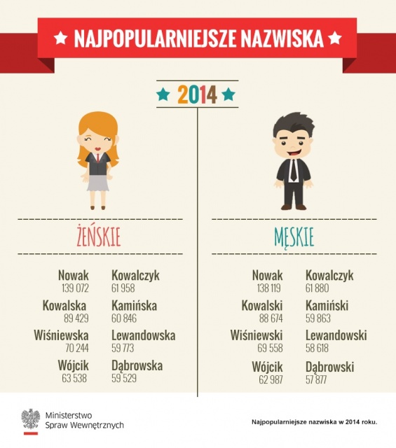 Nazwisko Nowak nosi aktualnie ponad 139 tys. kobiet oraz ponad 138 tys. mężczyzn. W całym kraju jest ponad 89 tys. kobiet o nazwisku Kowalska i ponad 88 tys. Kowalskich. Wiśniewska to nazwisko ponad 70 tysięcy kobiet, natomiast Wiśniewskich jest ponad 69 tys.