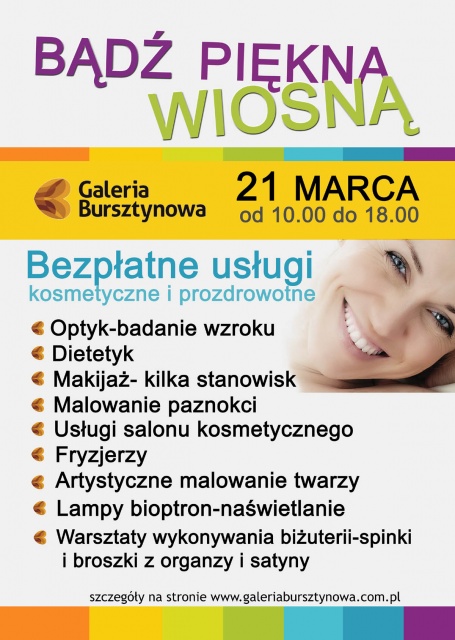 Tym razem w ramach przypadającego na 21 marca pierwszego dnia wiosny, klientki Galerii będą mogły skorzystać z bogatej oferty bezpłatnych usług renomowanych salonów kosmetycznych i porad prozdrowotnych. Panie przekonają się "na własnej skórze" jak zadbać o paznokcie, wykonać efektowny makijaż i stylową fryzurę oraz w miłej atmosferze poznają zasady zdrowego żywienia. Uczestniczki wydarzenia będą mogły także wziąć udział w konkursach z atrakcyjnymi nagrodami.