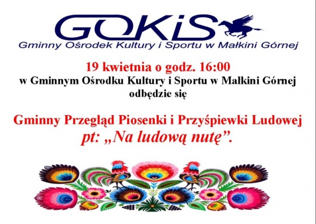 19 kwietnia o godz. 16:00 w Gminnym Ośrodku Kultury i Sportu w Małkini Górnej odbędzie się Gminny Przegląd Piosenki i Przyśpiewki Ludowej "Na ludową nutę".