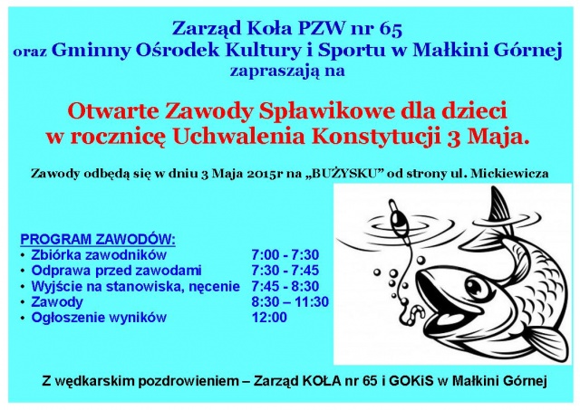 W rocznicę podpisania Konstytucji 3-go Maja w Małkini Górnej na "Bużysku" od strony ulicy Mickiewicza odbędą się Otwarte Zawody Spławikowe dla dzieci. Zawodnicy zbierają się w godz. 7:00-7:30. Zawody potrwają od 8:30 do 11:30. O godz. 12:00 zostaną ogłoszone wyniki. Zawody organizuje Gminny Ośrodek Kultury i Sportu w Małkini Górnej oraz Zarząd Koła Polskiego Związku Wędkarskiego nr 65.