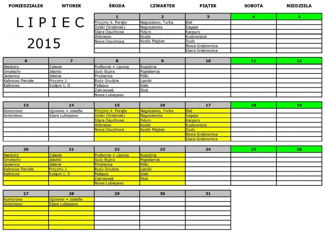 Dni zaznaczone kolorem białym na poniższym harmonogramie oznaczają odbiór odpadów zmieszanych, w dni zaznaczone kolorem żółtym będą odbierane odpady zmieszane i sortowane. Kolor zielony oznacza odbiór bioodpadów.