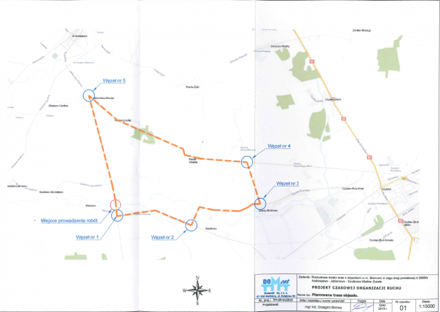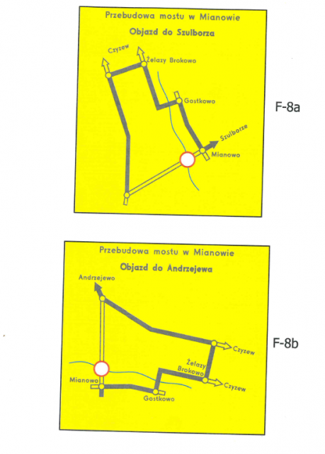 W związku z rozpoczynającą się rozbudową mostu w Mianowie wraz z przebudową dojazdów w ciągu drogi powiatowej Andrzejewo - Szulborze Wielkie Urząd Gminy Andrzejewo informuje, że w dniach 15.07.2015 r. -15.11.2015 r. obowiązywać będzie czasowa organizacja ruchu na powyższym odcinku drogi. Polegać ona będzie na całkowitym wyłączeniu mostu z ruchu i wyznaczeniu objazdów przez miejscowości Gostkowo - Żelazy-Brokowo - Pieńki Wielkie - Pieńki-Sobótki.