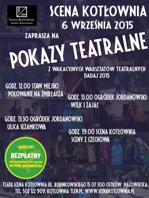 Powoli kończy się projekt Wakacyjne Warsztaty Teatralne DADAJ 2015. Przez dwa tygodnie młodzi artyści ze Sceny Kotłownia przygotowywali różne pokazy teatralne, które zostały zaprezentowane w Ośrodku Wczasowym Dadaj Star "Leśna przygoda" koło Olsztyna. Łącznie przygotowano dwanaście etiud teatralnych, pięć spektakli, trzy filmy, siedem scen z dramatów Czechowa, sześć monologów, sześć wierszy, jeden spektakl wierszem. Oprócz realizacji teatralnych uczestnicy warsztatów mieli codzienne zajęcia z dykcji, oglądali spektakle Teatru Telewizji oraz uczestniczyli w warsztatach ogólnorozwojowych. W czasie warsztatów rozpoczęły się prace nad trzema tytułami, które będą miały swoją premierę w najbliższym sezonie.