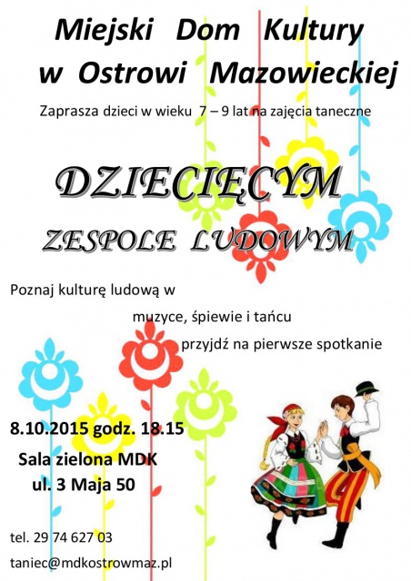 Dzieci w wieku od 7 do 9 lat Miejski Dom Kultury w Ostrowi Mazowieckiej zaprasza do uczestnictwa w nowej formie tanecznej w Miejskim Domu Kultury - dziecięcym zespole ludowym. Chcesz poznać kulturę ludową w muzyce, śpiewie i tańcu? Przyjdź na pierwsze spotkanie w najbliższy czwartek, 8 października o godz. 18.15 do siedziby MDK. Szczegółowych informacji udziela Bożena Jakubczyk telefonicznie po numerem 29 746 27 03 lub mailowo pod adresem [email protected].