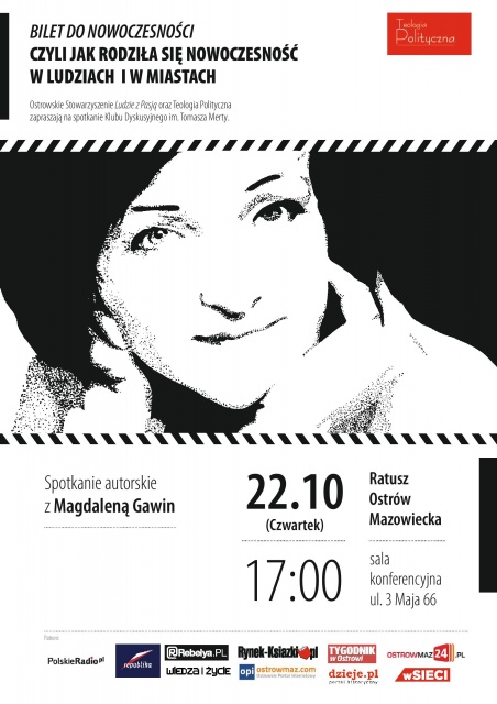 Będzie to spotkanie autorskie z dr Magdaleną Gawin wokół książki "Bilet do nowoczesności". Dr Magdalena Gawin - historyk IHPAN, prezes Stowarzyszenia Muzeum Historii Polski, historyk idei i eseistka. Zajmuje się dziejami XIX-XX wieku. Debiutowała książką na temat polskiego ruchu eugenicznego. Publikowała m.in. w "Tygodniku Powszechnym", "Rzeczpospolitej", "Wiedzy i Życiu", "Teologii Politycznej".