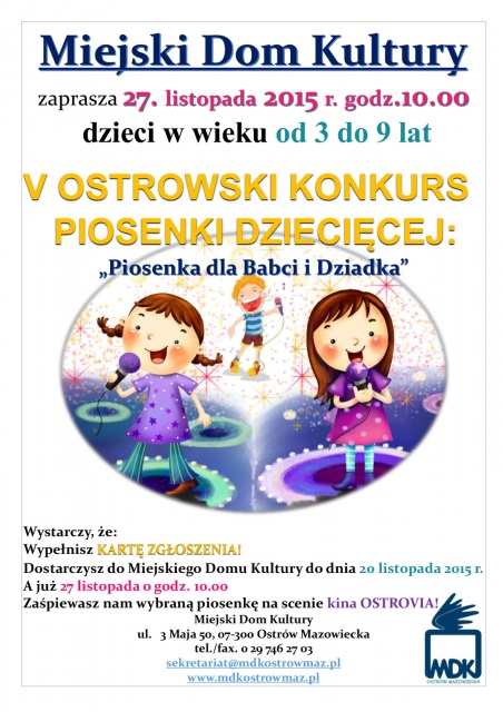 Konkurs "Piosenka dla Babci i Dziadka" odbędzie się 27 listopada 2015 r. o godz. 10.00 w sali kina "Ostrovia". MDK zaprasza również rodziców, dziadków, rodzeństwo, kolegów naszych wykonawców oraz wszystkich państwa do kibicowania i oklaskiwania młodych wokalistów podczas festiwalu. Wstęp wolny.