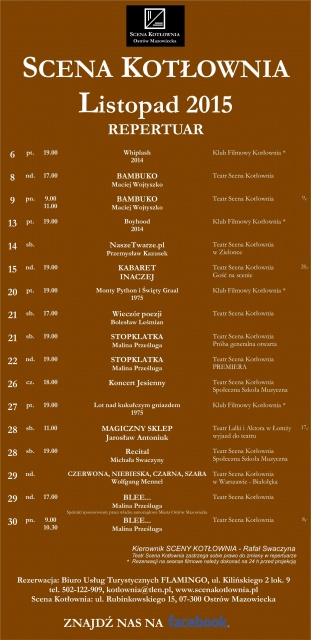 Jeśli chcecie być na bieżąco z informacjami o wydarzeniach w Teatrze Scena Kotłownia, odwiedzajcie naszą zakładkę Scena Kotłownia, stronę internetową www.scenakotlownia.pl oraz fanpage na facebooku Teatr Scena Kotłownia.