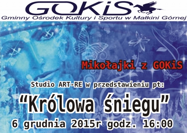 Już 6 grudnia o godz. 16:00 w Gminnym Ośrodku Kultury i Sportu w Małkini Górnej zobaczyć będzie można aktorów Studia ART-RE w przedstawieniu "Królowa Śniegu". Jest to prezent dla najmłodszych z okazji mikołajek.