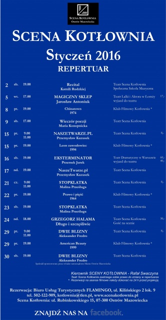 W styczniu Scena Kotłownia zaprasza na trzy spektakle: "NaszeTwarze.pl", "Stopklatka" i "Dwie blizny". Czterokrotnie w ramach Klubu Filmowego Kotłownia na seans filmowy spotkają się miłośnicy kina. W tym miesiącu po raz kolejny aktorzy Sceny Kotłownia zaprezentują poezję podczas wieczoru z poezją. Tym razem na warsztat wezmą utwory Marii Konopnickiej. Tradycyjnie też do ostrowskiego teatru zawita gość miesiąca, którym tym razem będzie Grzegorz Halama.