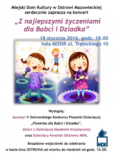 Serdecznie zapraszamy wszystkich Państwa 18 stycznia na widownię hali MOSiR przy ulicy Henryka Trębickiego. Początek koncertu o godz. 18:00. Bezpłatne wejściówki do odebrania w kasie kina OSTROVIA od wtorku do niedzieli od godz. 16.00.