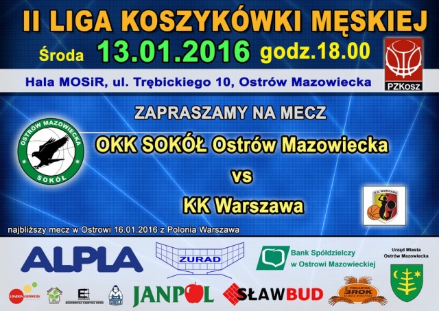 13 stycznia o godz. 18:00 na hali MOSiR przy ulicy Trębickiego w Ostrowi rozpocznie się spotkanie drużyn Sokół Ostrów Mazowiecka i KK Warszawa. Będzie to pierwszy mecz rozegrany przez Sokoła w nowym roku na własnym parkiecie.