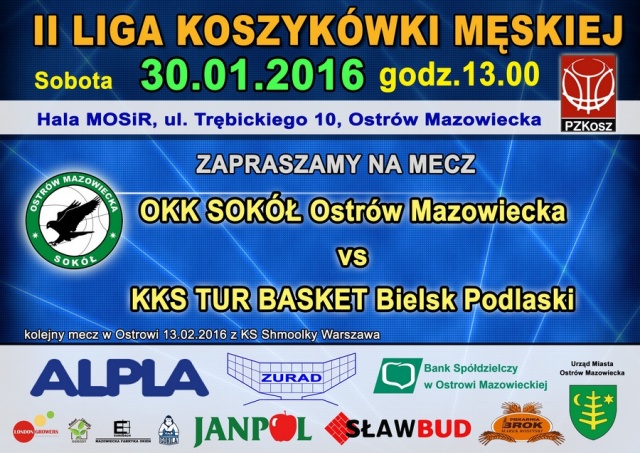 Już jutro o godz. 13:00 na hali MOSiR przy ulicy Trębickiego w Ostrowi Mazowieckiej odbędzie się kolejny mecz koszykówki II ligi grupy B. Tym razem rywalem Sokoła będzie drużyna KKS Basket Tur Bielsk Podlaski.