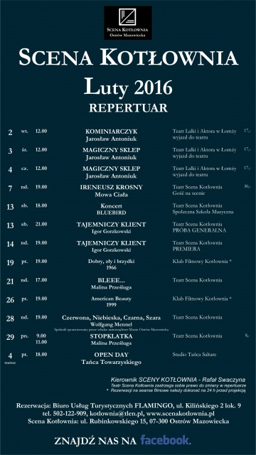 Jeśli chcecie być na bieżąco z informacjami o wydarzeniach w Teatrze Scena Kotłownia, odwiedzajcie naszą zakładkę Scena Kotłownia, stronę internetową www.scenakotlownia.pl oraz fanpage na facebooku Teatr Scena Kotłownia.