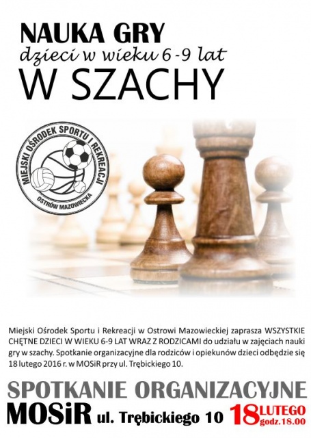 Miejski Ośrodek Sportu i Rekreacji w Ostrowi Mazowieckiej zaprasza wszystkie chętne dzieci w wieku 6-9 lat wraz z rodzicami do udziału w zajęciach nauki gry w szachy. Spotkanie organizacyjne dla rodziców i opiekunów dzieci odbędzie się 18 lutego 2016 roku w MOSiR przy ulicy Trębickiego 10.