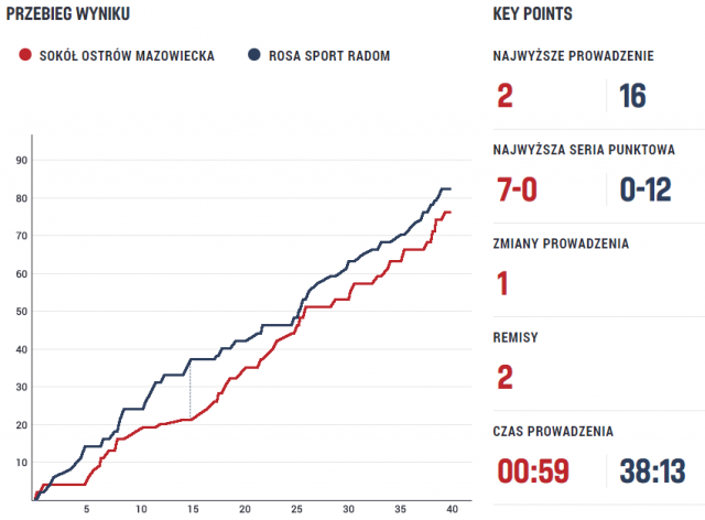 Po przerwie Sokół grał znacznie lepiej i szybko nadrobił stracone punkty. W połowie trzeciej kwarty Rosa Sport Radom prowadziła już tylko dwoma punktami - 50:48. Ostatecznie mecz zakończył się wynikiem 82:76 dla gości.