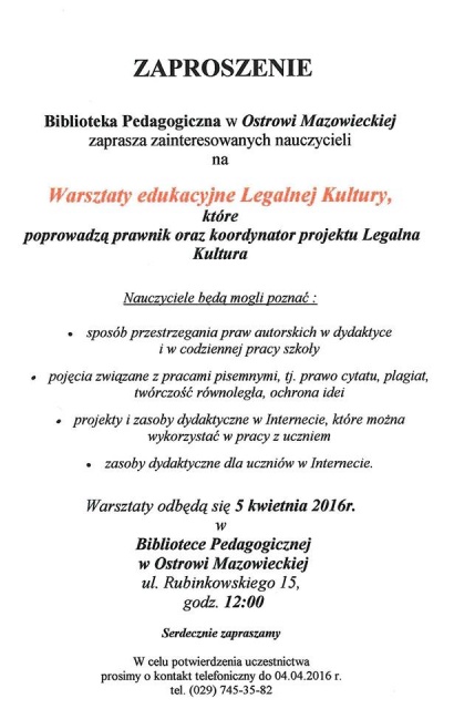 5 kwietnia o godz. 12:00 w Bibliotece Pedagogicznej przy ulicy Rubinkowskiego 15 w Ostrowi odbędą się warsztaty edukacyjne Legalnej Kultury, które poprowadzą prawnik oraz koordynator projektu Legalna Kultura. Warsztaty skierowane są do nauczycieli, którzy chcą poznać prawa autorskie i sposoby ich przestrzegania w codziennej pracy dydaktycznej oraz zasoby dydaktyczne, znajdujące się w Internecie, które pomogą uczniom oraz nauczycielom w pracy z podopiecznymi. W celu potwierdzenia udziału w warsztatach należy dzwonić do 4 kwietnia pod nr tel. (029) 745-35-82.