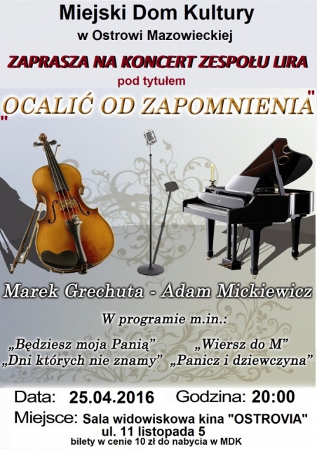 Aby przypomnieć najpiękniejsze utwory Grechuty, Miejski Dom Kultury w Ostrowi zorganizował koncert oparty na jego utworach, takich jak chociażby "Będziesz moja panią", "Niepewność", "Wiosna, ach to ty", "Dni, których nie znamy", "Nie dokazuj". Podczas koncertu będzie można również usłyszeć utwory naszego wieszcza narodowego Adama Mickiewicza: "Wiersz do M.", "Czaty", "Panicz i dziewczyna", "Pieśń Filaretów" z muzyką i aranżacją Andrzeja Rutkowskiego.