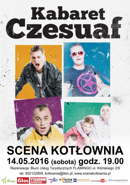 Kabaret Czesuaf to profesjonalne, wszechstronne, geograficznie i sezonowo nieograniczone poprawianie nastrojów, wywoływanie uśmiechów, wprawianie w dobry humor. Oferują dobre żarty, zgrabne puenty oraz piosenki z dobrym tekstem i nienachalnym wokalem. W cenę wliczone 10-letnie doświadczenie sceniczne, zadowolenie klienta oraz niebanalna uroda zespołu. Uwaga - bisy gratis!
