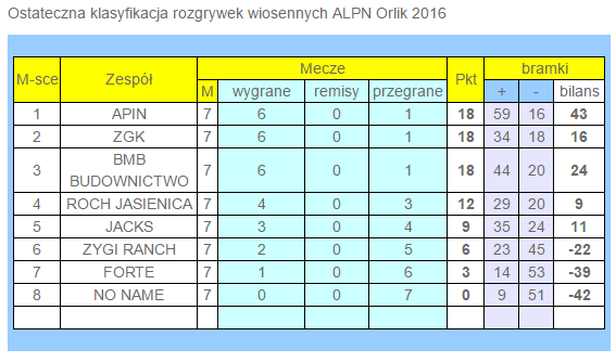 Ostatecznie wiosenną edycję ALPN wygrał zespół APIN, drugie miejce zajął ZGK, a na trzecim miejscu uplasował się BMB Budownictwo. Najskuteczniejszym strzelcem został Prusak Marcin z zespołu APIN, który zdobył 19 bramek.