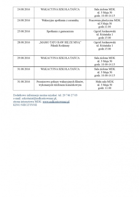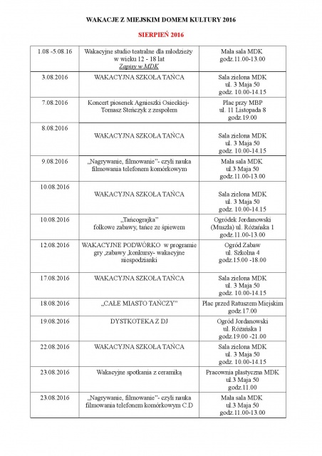 Sierpień z Miejskim Domem Kultury to przede wszystkim zajęcia wakacyjnej szkoły tańca i zabawy taneczne. Dodatkowo chętni będą mieli okazję nauczyć się kręcić filmy telefonem i - podobnie jak w poprzednim miesiącu - wziąć udział w warsztatach ceramicznych.