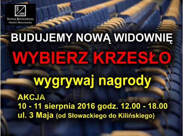 W dniach 10 - 11 sierpnia 2016 r. w godzinach od 12.00 do 18.00 będzie można usiąść na kilku krzesełkach zaprezentowanych przez teatr i oddać głos na jedno z nich. Te krzesełko, które zdobędzie największą ilość głosów, będzie służyć naszym mieszkańcom przez kilkanaście lat.