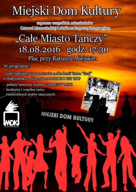 18 lipca o godz. 17:30 na placu przy Ratuszu Miejskim odbędzie się impreza integracyjna dla wszystkich mieszkańców Ostrowi Mazowieckiej "Całe Miasto Tańczy". Będzie się działo! W programie konkursy, pokazy taneczne zespołu "ZAMENT", wspólne tańce różnorodnych stylów tanecznych - każdy znajdzie coś dla siebie.