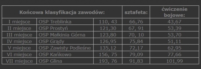 Zawody rozpoczęły się sztafetą pożarniczą 7 x 50 m z przeszkodami, następną konkurencją było ćwiczenie bojowe. Po zakończeniu konkurencji odbył się pokaz rozwinięcia bojowego zorganizowany przez Młodzieżowe Drużyny Pożarnicze z Małkini Górnej i Prostyni.
