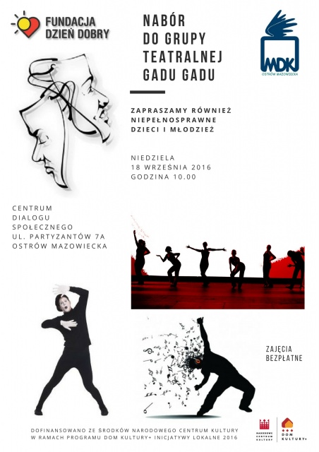 Fundacja Dzień Dobry i Miejski Dom Kultury w Ostrowi Mazowieckiej zapraszają pełno i niepełnosprawne dzieci i młodzież do wzięcia udziału w nowotworzonej grupie teatralnej Gadu Gadu.