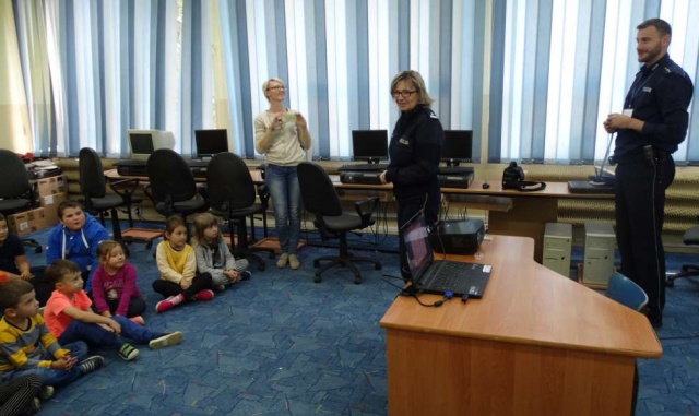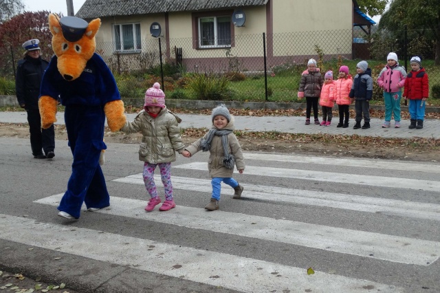 Na zakończenie spotkania przeprowadzono z przedszkolakami praktyczną naukę bezpiecznego przechodzenia przez przejście. W nauce dzieciom pomagała maskotka ostrowskiej Policji - Lisek.