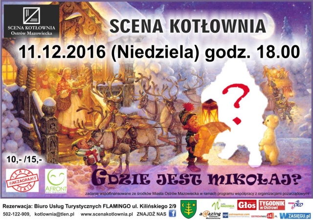 Teatr Scena Kotłownia zaprasza na spektakl improwizowany, podczas którego publiczność będzie razem z nimi tworzyć opowieść, która postara się odpowiedzieć na pytanie. Gdzie jest Mikołaj?