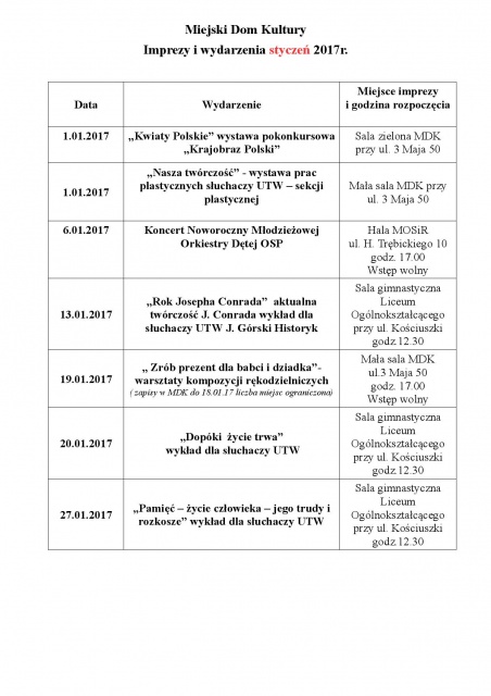 Ponadto w styczniu w MDK-u obejrzeć można dwie wystawy. Jedna dostępna będzie w sali zielonej - jest to pokonkursowa wystawa "Kwiaty Polskie". Z kolei drugą wystawę można oglądać w małej sali MDK. Na tę wystawę składają się prace sekcji plastycznej UTW.