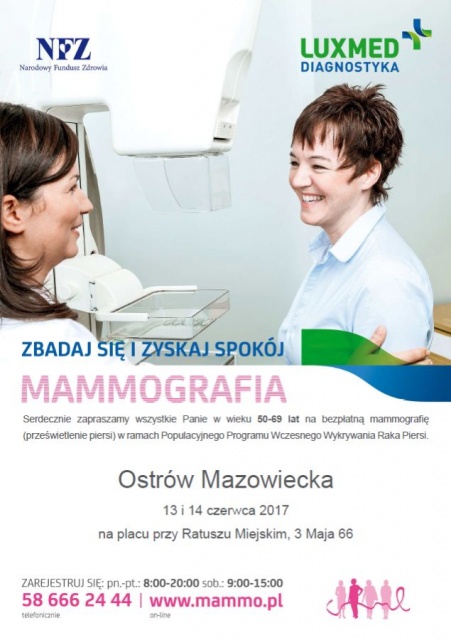 Bezpłatne badania mammograficzne w mammobusie odbędą się 13 i 14 czerwca na placu przy Ratuszu Miejskim, 3 Maja 66.