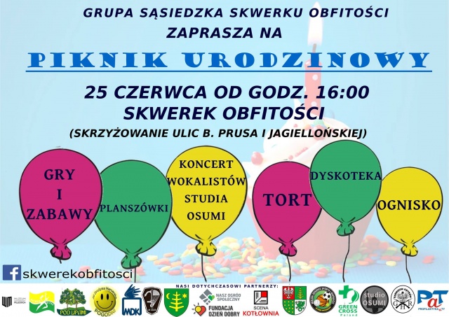 Piknik z okazji pierwszych urodzin Skwerku Obfitości odbędzie się 25 czerwca u zbiegu ulic Bolesława Prusa i Jagiellońskiej. Początek wydarzenia o godz. 16:00.