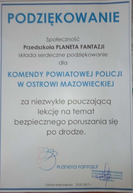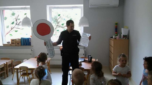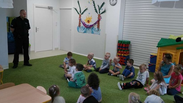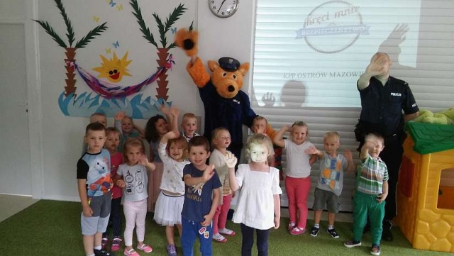 W związku z trwającymi wakacjami funkcjonariusze rozmawiali o bezpieczeństwie podczas pobytu nad wodą w ramach akcji "Kręci mnie bezpieczeństwo nad wodą". Ponadto podczas spotkania omówili z przedszkolakami numery alarmowe oraz sytuacje, w jakich należy z nich korzystać. W spotkaniu z dziećmi uczestniczył też Ostrowski Lisek, jego wizyta sprawiła dzieciom ogromną radość. Na pamiątkę wizyty policjanci otrzymali ogromną "tarczę" przygotowaną przez przedszkolaków.