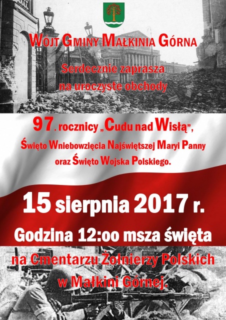 Urząd Gminy Małkinia Górna zaprasza na uroczyste obchody Święta Wniebowzięcia NMP, Święta Wojska Polskiego i 97. rocznicy "Cudu nad Wisłą".