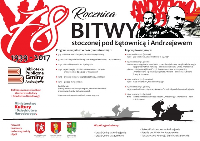 Uroczystość odbędzie się 17 września 2017 r. Patronat honorowy nad uroczystością obejmą: Wójt Gminy Andrzejewo Michał Rutkowski, Wójt Gminy Szumowo Jarosław Cukierman, Starosta Ostrowski Zbigniew Kamiński.