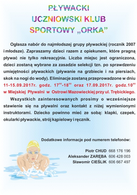 Zapraszamy dzieci razem z opiekunem, które pragną pływać nie tylko rekreacyjnie. Liczba miejsc jest ograniczona, dzieci zostaną wybrane na zasadzie selekcji tzn. po sprawdzeniu umiejętności pływackich (pływanie na grzbiecie i na piersiach, skok na nogi do wody). Eliminacje zostaną przeprowadzone w dniach 11-15.09.2017r. godz. 17.00 - 18.00 oraz 17.09.2017r. godzina 10.00 w Miejskiej Pływalni w Ostrowi Mazowieckiej przy ul. Trębickiego.