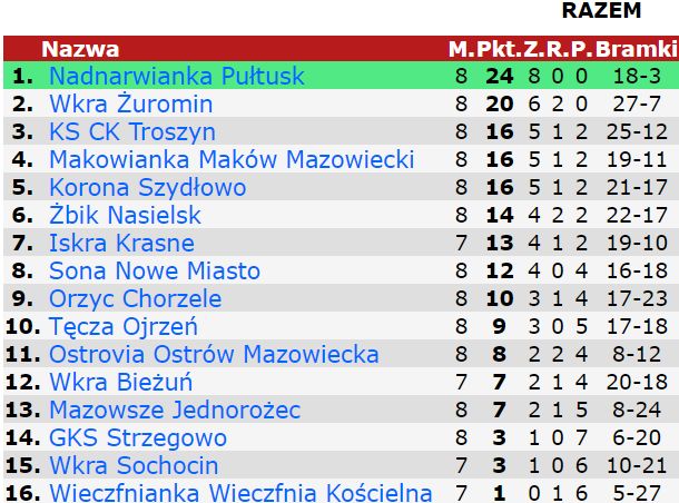 Po ośmiu kolejkach drużyna KS Ostrovi Ostrów Mazowiecka zajmuję 11 lokatę w tabeli z dorobkiem 8 punktów.