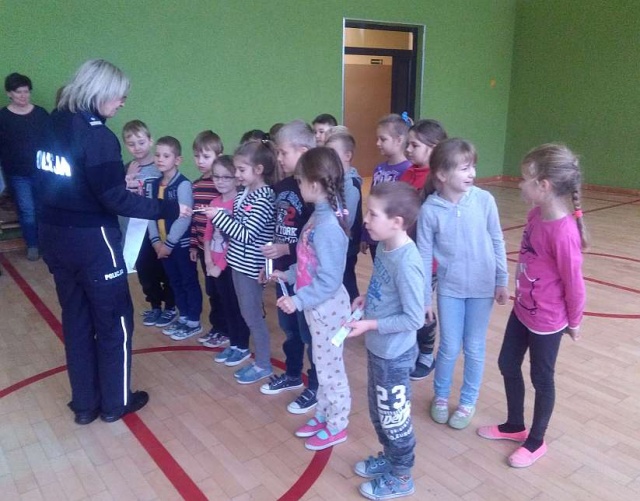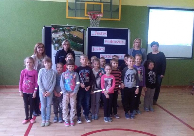 Na zakończenie spotkania uczniowie klas I i II otrzymali opaski odblaskowe ufundowane przez Urząd Marszałkowski Województwa Mazowieckiego.